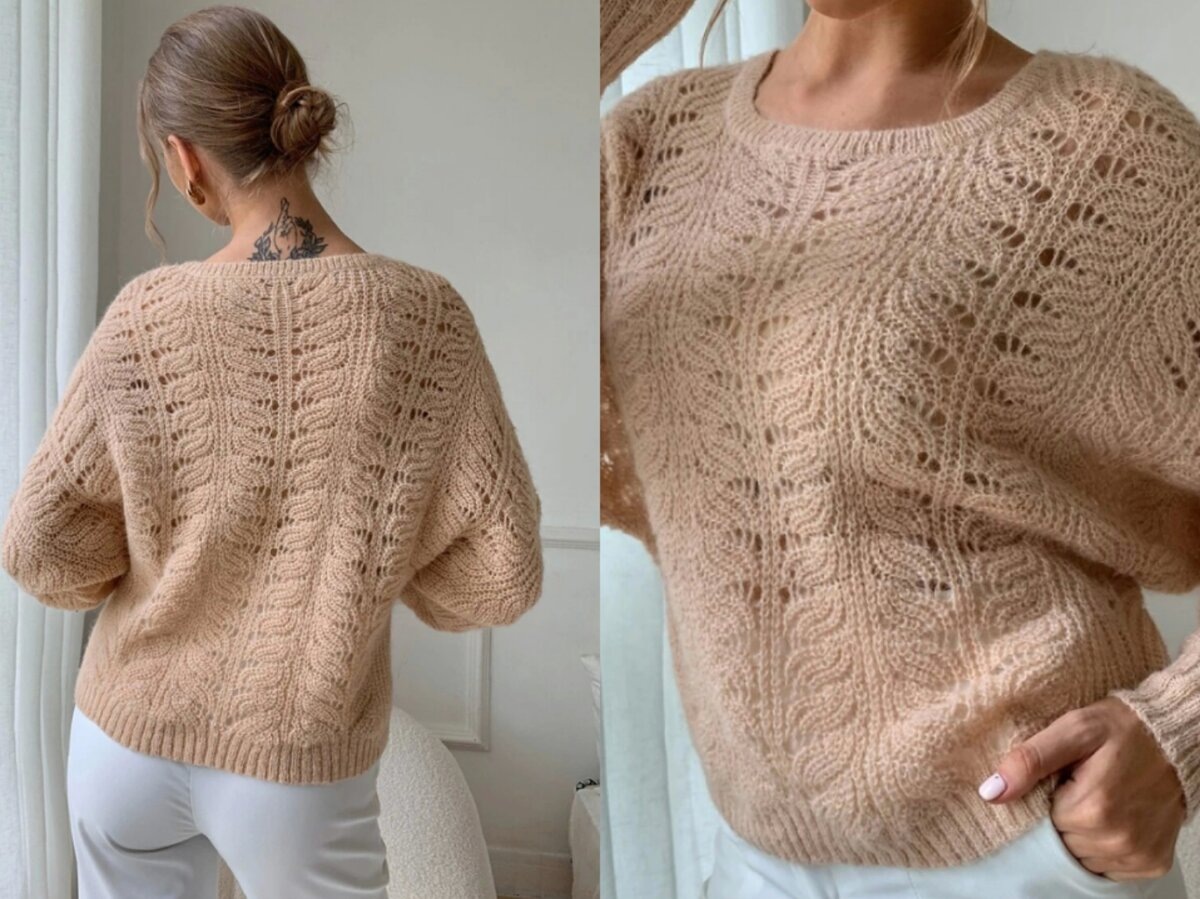 Модель широкая в верхней части и заужена книзу, вяжется плюс минус на основе выкройки, которую я прикрепила ниже. Круглый вырез горловины, манжеты и низ изделия обработаны резинкой один на один. Основное полотно вяжется ажурным узором на базе патентной резинки.