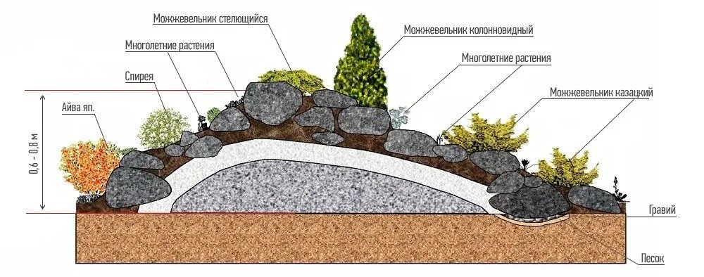 Вы определили место для будущей композиции, подобрали камни и растения. Теперь дело за малым — воплотить идею в жизнь. Найдите на своем участке пространство, на котором можно сделать возвышенность, разметьте его и начинайте работу.