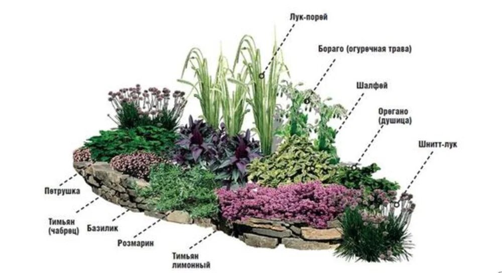 Почвопокровные: полынь, камнеломка, живучка ползучая, стахис, арабис. Многолетние культуры: флокс, эхинацея, рододендрон, барвинок, молодило, родиола, алиссум.