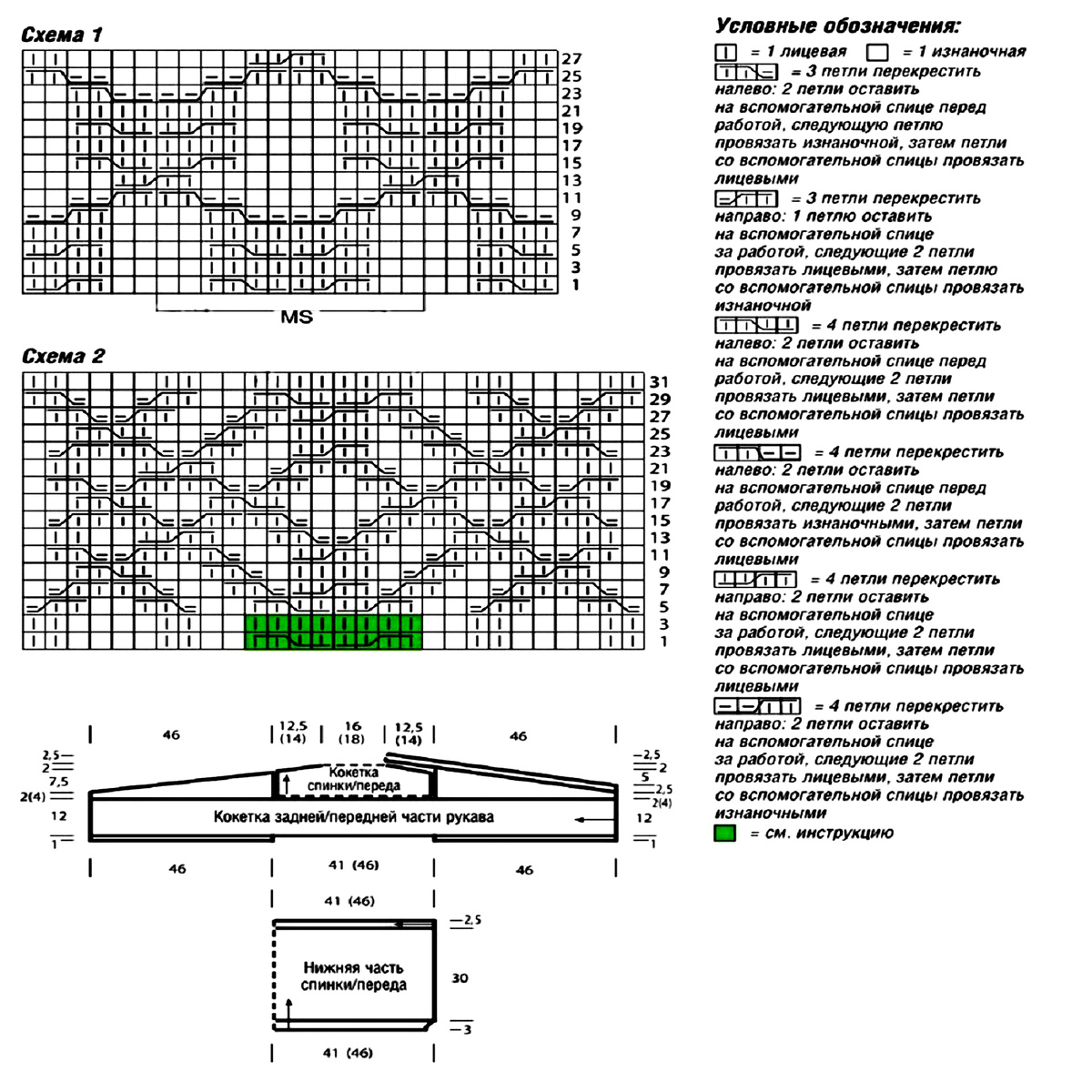 Узор 2: узор из «кос» и ромбов (число петель кратно 12+2 кромочные) = вязать согл. схеме 1. На ней даны лицевые ряды. В изнаночных рядах все петли провязывать по рисунку. Начать с 1 кромочной и петель перед раппортом, раппорт постоянно повторять, закончить петлями после раппорта и 1 кромочной. Постоянно повторять 1-28-й ряды.