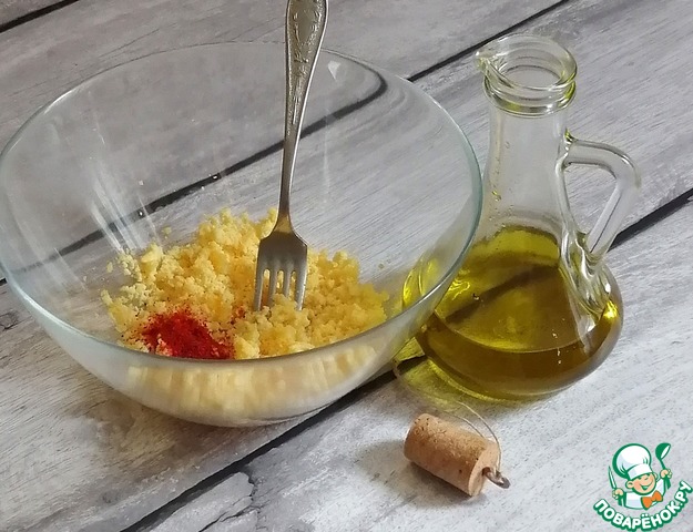 Отваренные желтки натереть на мелкой тёрке, или растереть вилкой, как вам удобно.