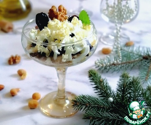 Теперь собираем салат. В креманки, порционные салатники или на блюдо - последовательность слоёв не меняется.
