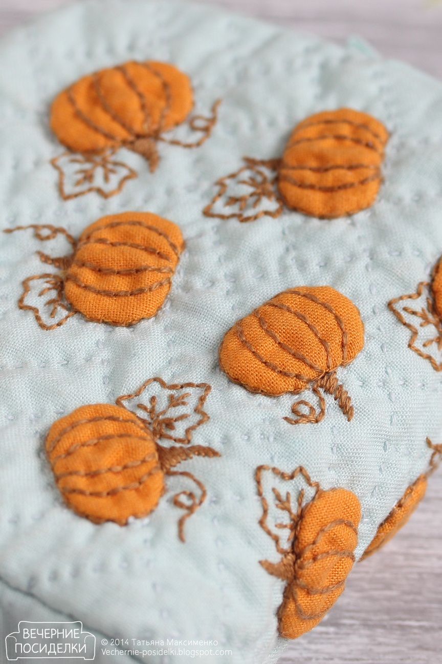Тыковки размером 2х1,3см — объёмная аппликация. На косметичку вместилось 15 штук. Основа простёгана прямоугольниками, направленными в разные стороны.