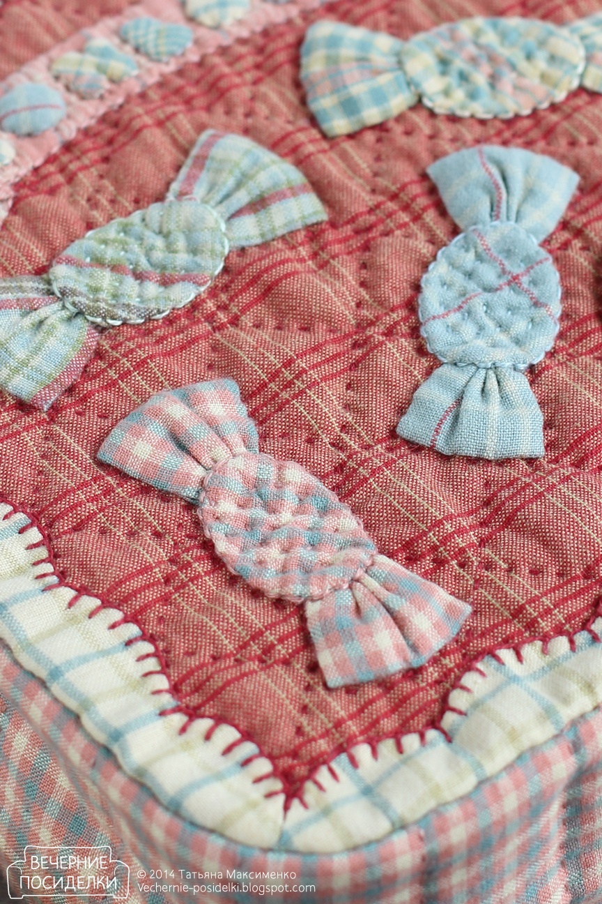 Края всех деталей аппликации подвёрнуты и пришиты потайным швом. Конфетки простёганы по спирали нитками в тон, по контуру шов «назад иголку».