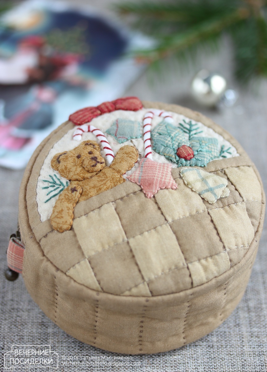 Немного отвлеклась от ёлочных игрушек, но конечно же не от новогодней темы. Любимый в последнее время объект для экспериментов — косметичка — сегодня в образе новогодней корзинки с подарками. Размер у неё правда такой, что вполне и за ёлочную игрушку сойдёт — диаметр всего 10,5см. :-) Квадратики для «плетёного» основания корзинки сшила ещё две, а то и три недели назад, и по первоначальной задумке корзинка вообще-то должна была быть с шиповником (навеяно моей прошлогодней аппликацией на основе из двухцветных квадратиков). Но переключилась на ёлочные игрушки, момент ушёл, осеннее шить уже совсем расхотелось... Но не пропадать же идее-то! Так что наполнение «корзинки» сменилось по сезону: плюшевый мишка, леденцы, звёздочки, колокольчик, остролист и еловые веточки.