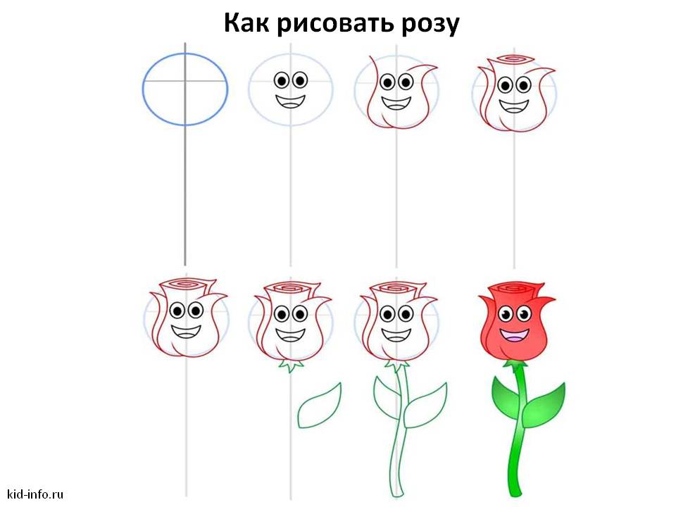 Используя данные инструкции поэтапного рисования розы, оформить открытку или рисунок смогут доже самые маленькие. Конечно же, если немного помогут родители.