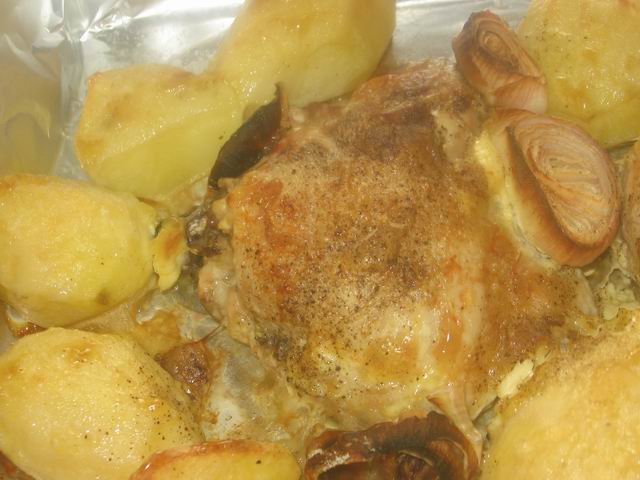 Очень просто. Нужно иметь один - два окорочка, несколько картофелин, 1-2 луковицы, пару помидор, 1 столовую ложку майонеза, соль, специи. Вкуснота необыкновенная и никаких усилий!