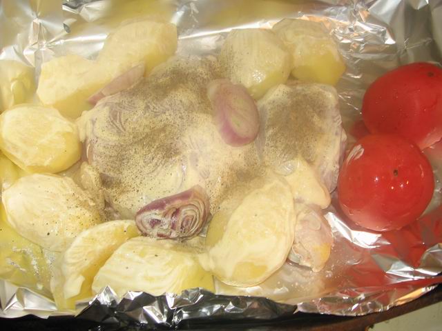 Противень хорошо застилаем фольгой. Выкладываем на него окорочки, картофель, помидоры, лук. Крупные картофелины и лук нужно разрезать.