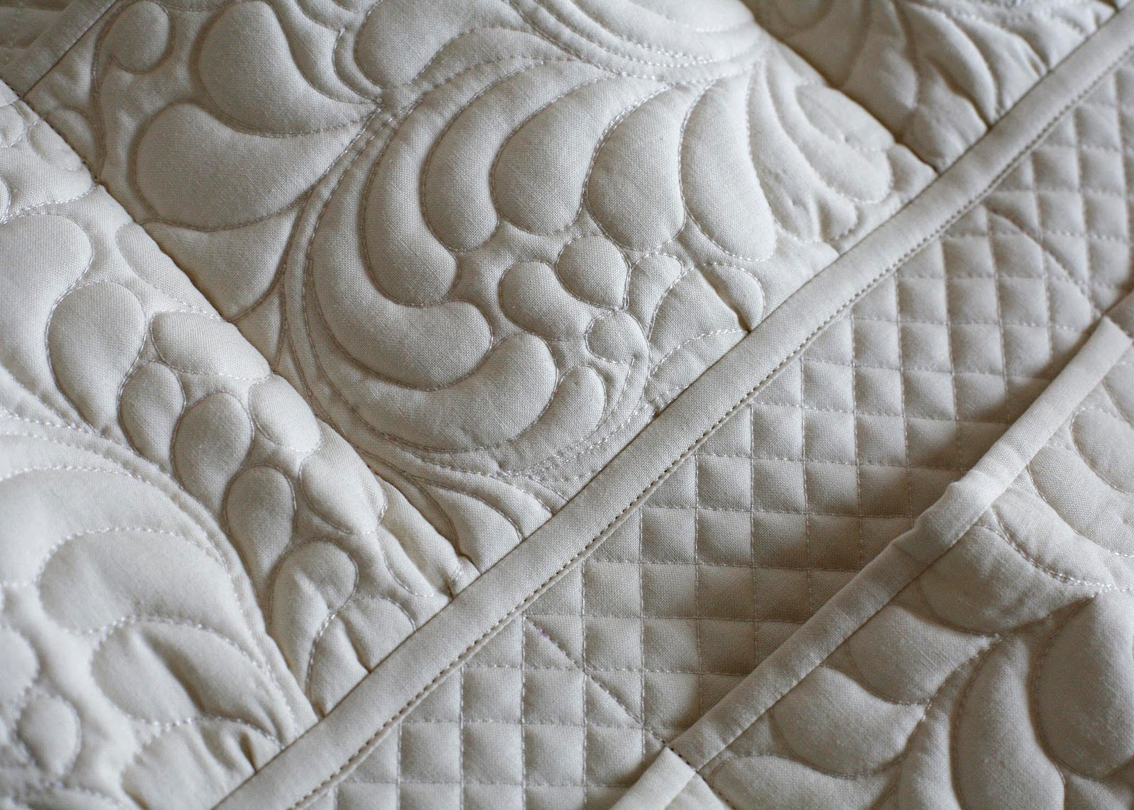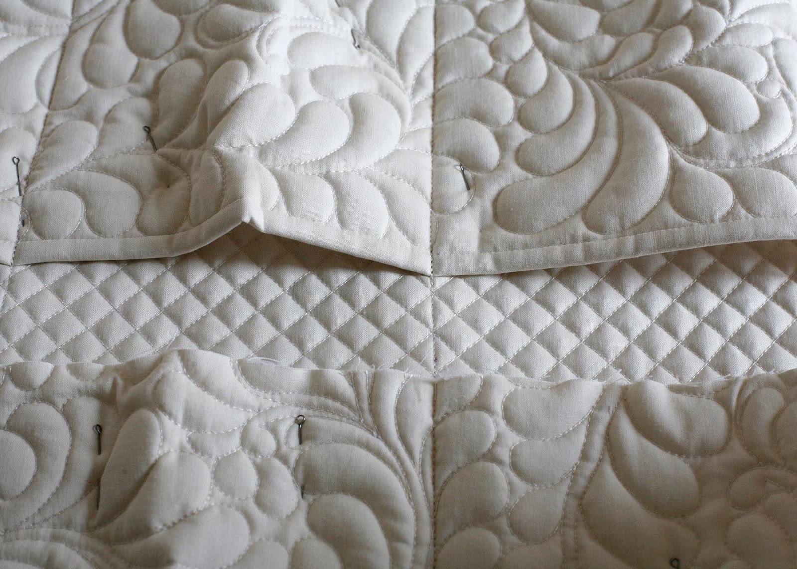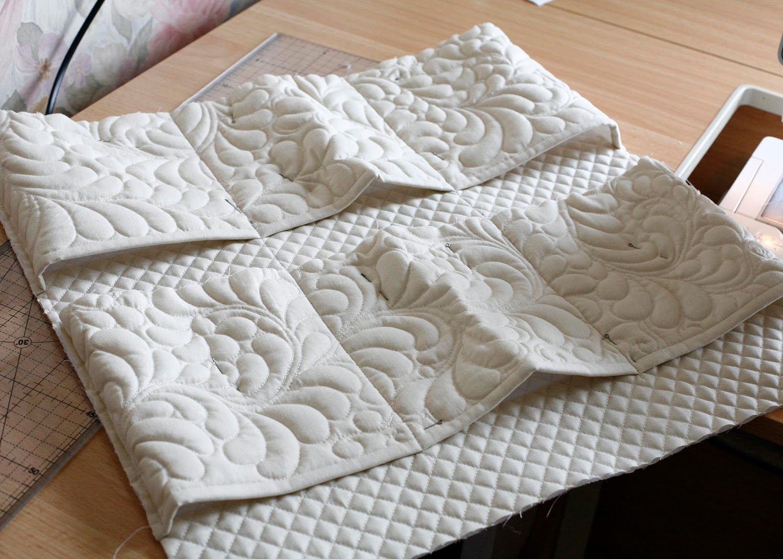 1. Выстегиваем квадрат из однотонной ткани. Я сделала перья. Размер итоговых кармашков 45*45 см. Из этой а-ля трапунто ткани будут сами кармашки.