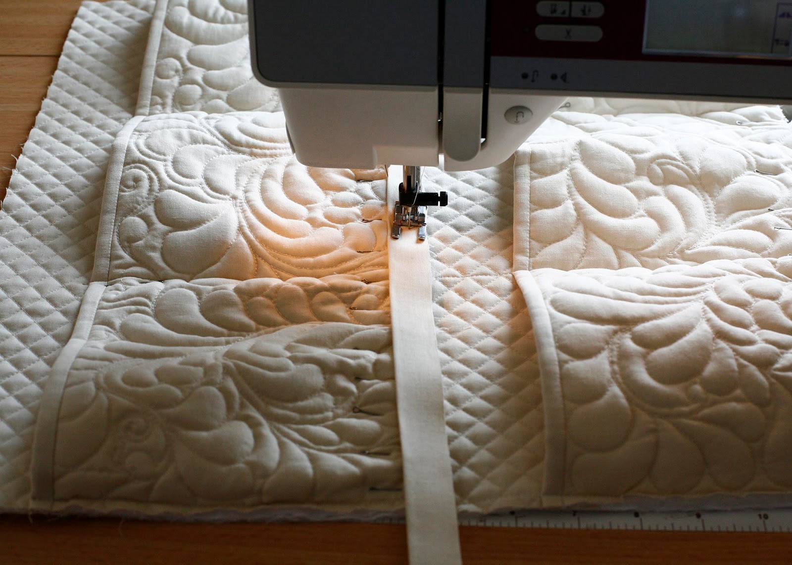просто застрачиваем обычной строчкой, на обычном ходу машины. Как практика показывает чередование перьев и геометрических линий дает максимальные акценты на рельеф трапунто.