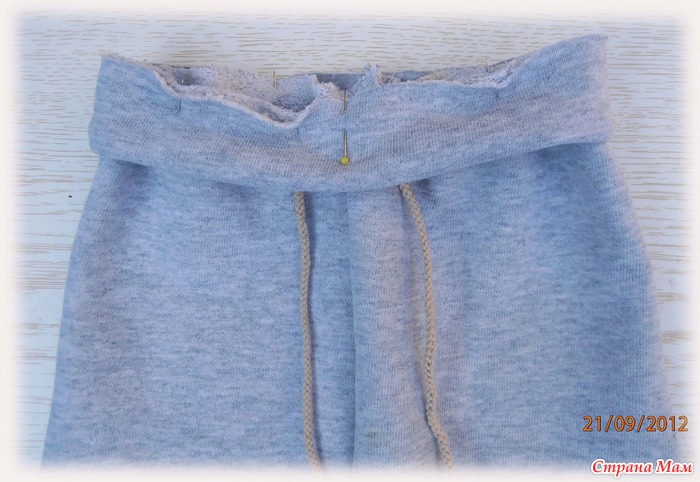 Складываем пояс вдвое и прикалываем к верху штанишек.