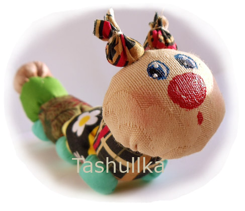 Гусеница в длину примерно 30 см. Не гремит. Присмотрела ее в каком-то японском журнале. Ох, и повозилась же я с ней. Кучу лапок и колечек шить оказалось не так уж просто.