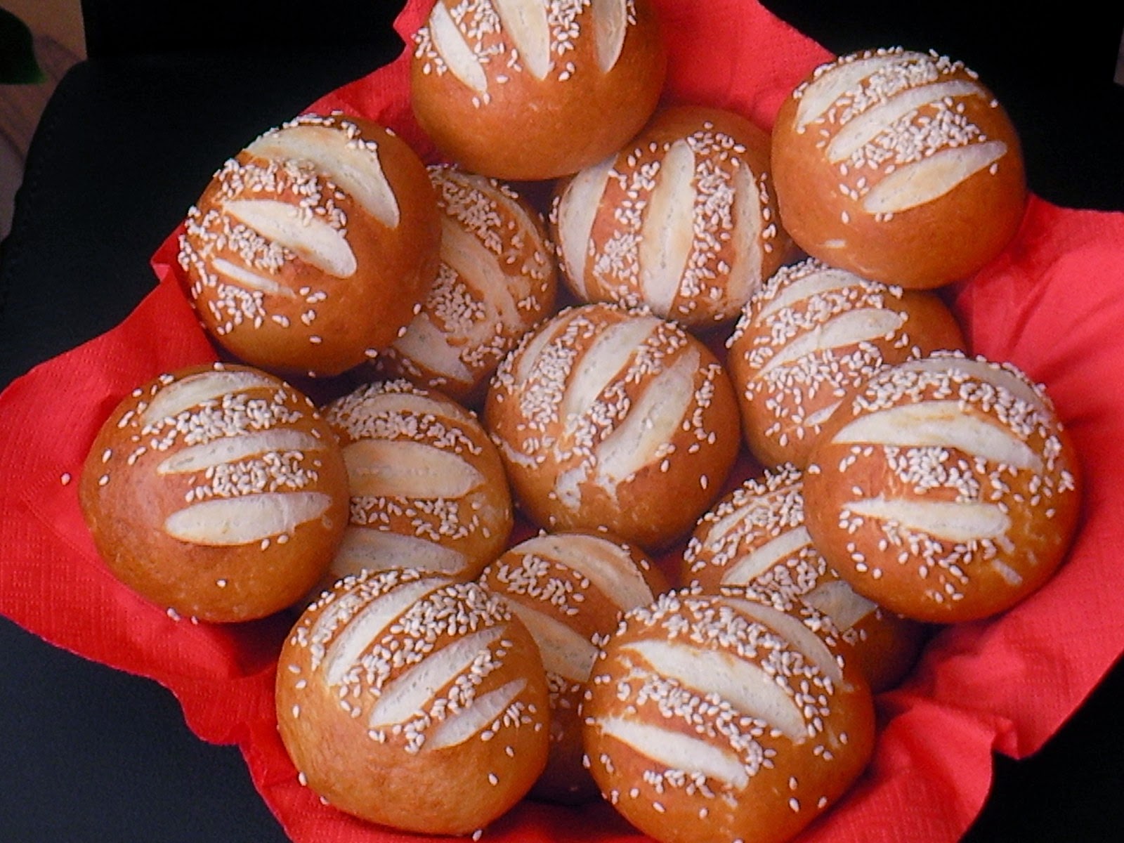 Втасалото тесто разделете на 14 равни части.Оформете хубави топчета.Всяко топче пускате за 30 секунди във вряща вода със сода и сол.Вадете ги на обложена тава с хартия и намазана с олио.Поръсете всяко със сусам,и с остър нож ги резнете на няколко места.Печем/без да втасват/ на 200 градуса до готовност.