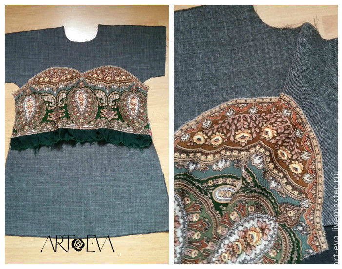 Вырезаем из лоскута павловопосадского платка нужный нам фрагмент, примеряем его к передней детали платья. Если нас все устраивает, то укрепляем его с изнаночной стороны дублерином для того, чтобы обрезанные края фрагмента не осыпались.