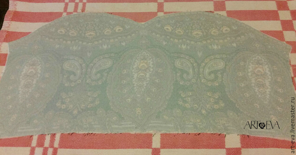 После вырезания фрагмента у меня остался кусок каймы платка, он неровный и растрепанный. Мне понравился именно такой вид, и я решила оставить его как есть, только выровнять по ширине.