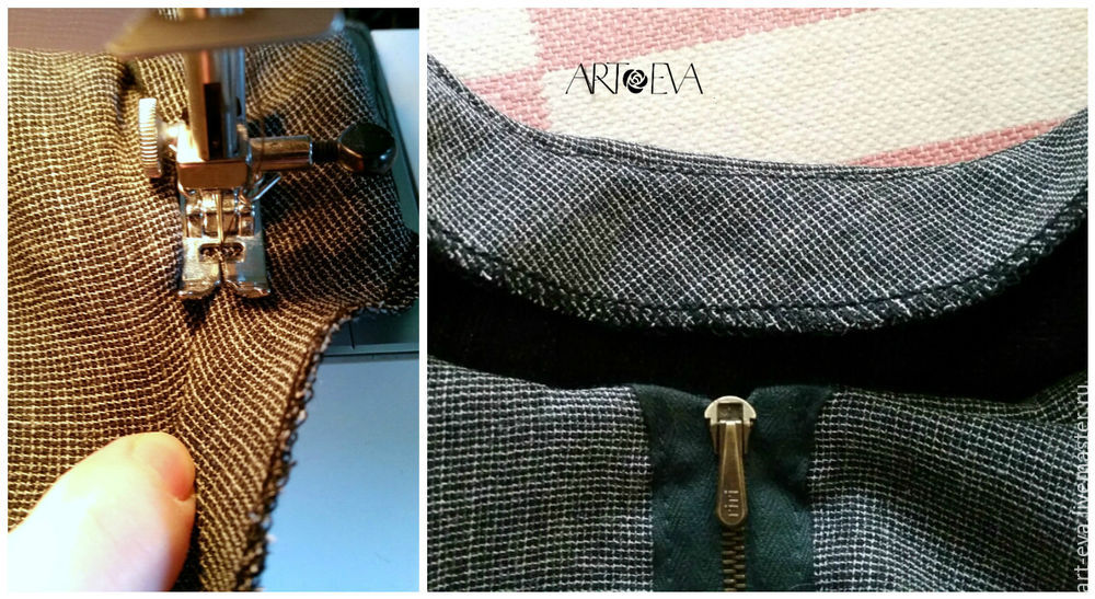 Для этого прикладываем молнию к спинке и приметываем верхние концы молнии только к основной детали спинки, без обтачки. А дальше расстегиваем молнию до конца и выворачиваем нашу обтачку обратно на лицо спинки таким образом, чтобы концы молнии оказались между деталью спинки и обтачкой. Скалываем конструкцию портновскими булавками и притачиваем обтачку к горловине почти до плечевых швов, не доходя до них примерно 2 см.