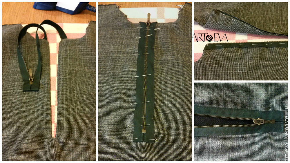Обратно выворачиваем обтачку наизнанку. Теперь нам нужно вшить молнию. Прикалываем ее портновскими булавками строго посередине нашего обработанного разреза. Нижние концы молнии подгибаем на изнанку (молнии). Пристрачиваем специальной лапкой для молнии на расстоянии примерно 0,2 см от края. Размер стежка лучше сделать побольше (у меня 3,5). С изнанки я подшила припуск вручную.