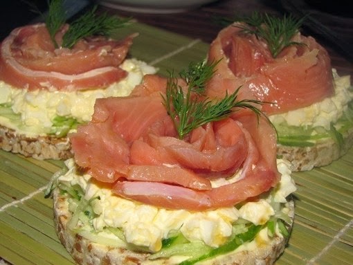 Приготовление: 1. Яйца отварить до готовности, очистить и меленько порезать. Добавить майонез (по вкусу), перемешать. 2. Свежие огурцы вымыть, натереть их на тёрке для корейской морковки. 3. Собираем бутербродики: хлебцы слегка смазать майонезом, положить слой огурцов, на них выложить яйца, а сверху кусочки горбуши. Украсить по желанию.