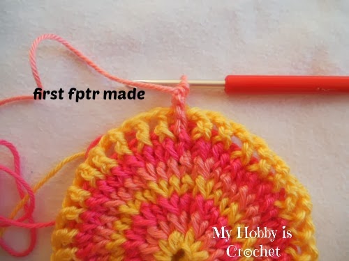 Раунд 7: продолжить с цветом (лимонад), сн4, *пропустить следующий ст, работа 1fptr вокруг следующего ст, ч1 *, повторить от * до * вокруг. SL-й с b цвета (хурма) в верхней части первой fptr. (36 fptr и 36 ч1 пространств общая)