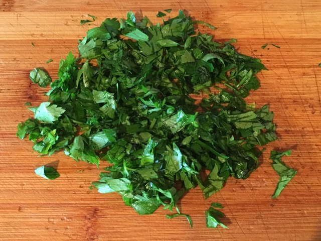 Добавляем пропущенный через пресс чеснок, 2/3 петрушки, соль, перец, винный уксус и оливковое масло. Хорошо перемешиваем. Пробуем и добавляем по вкусу соли, перца, уксуса или чеснока, если нужно.