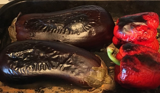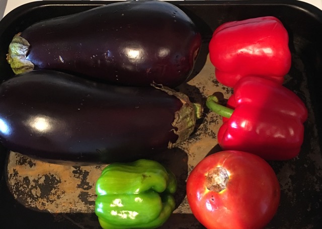 Кладем баклажаны, перцы и помидор в форму для запекания, которую можно ставить под гриль в духовку. Хорошо разогреваем духовку. Ставим овощи близко под включенный верхний гриль.