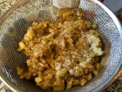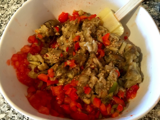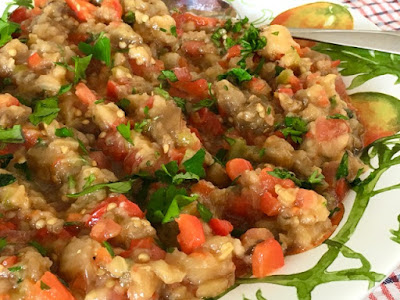 Я в этот раз делала эту закуску скорее как салат/гарнир, и измельчала ингредиенты ножом, но можно измельчить их и в комбайне, если больше хочется гладкое пюре/икру.