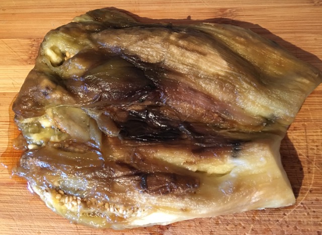 Большим острым ножом измельчаем баклажаны в грубое пюре.