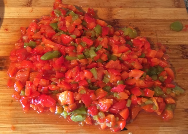 Сладкие перцы очищаем от шкурок, перемычек и семян и также мелко нарезаем ножом. Помидор тоже мелко режем.