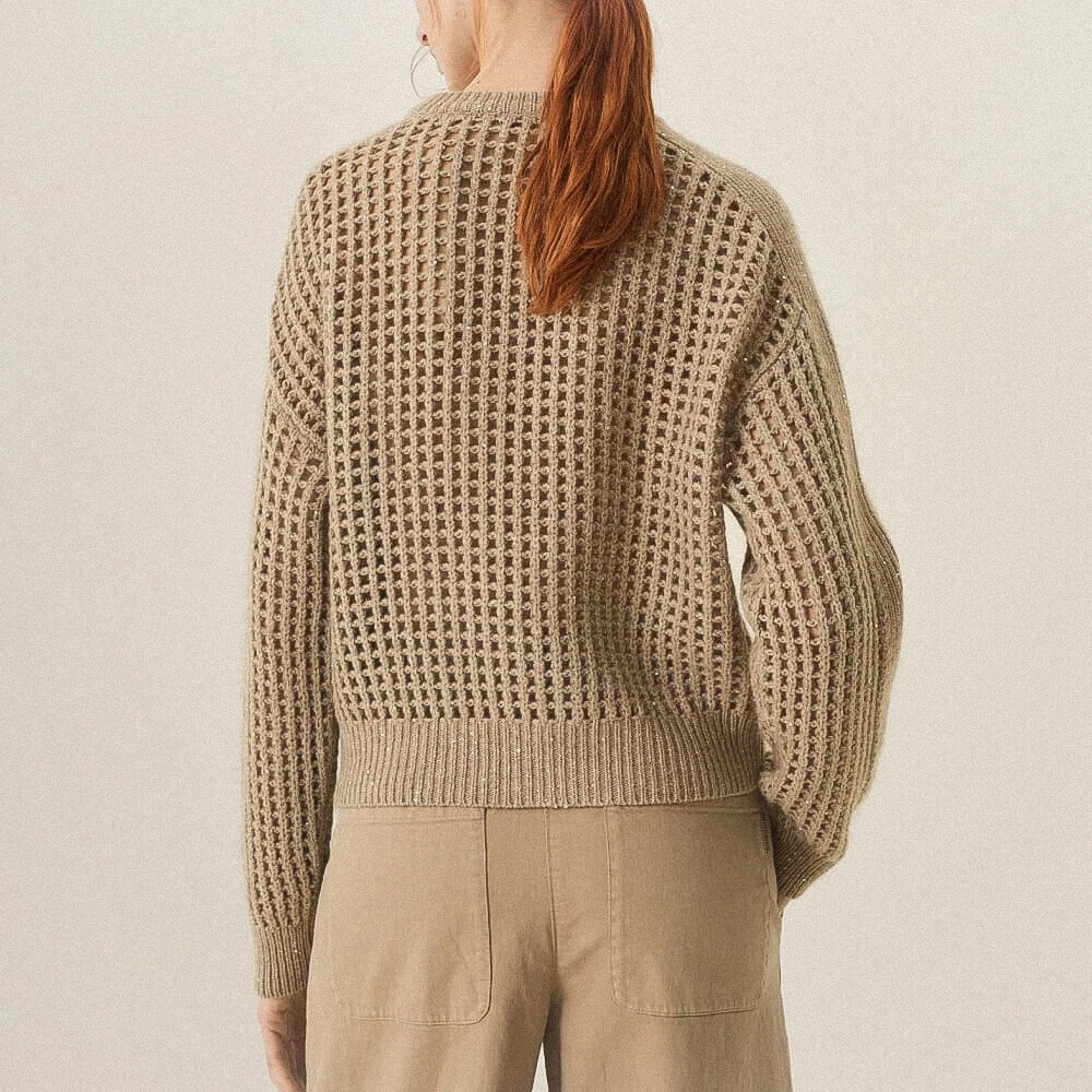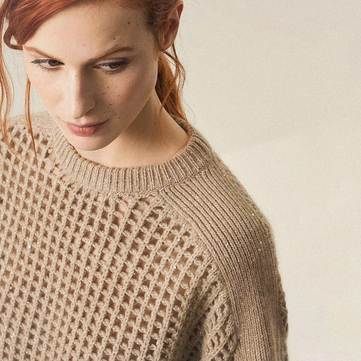 На этот раз нить не только с мелкими пайетками, но и серебристой нитью люрекса. У Кучинелли такой тандем смотрится не чрезмерно, а лаконично и деликатно.