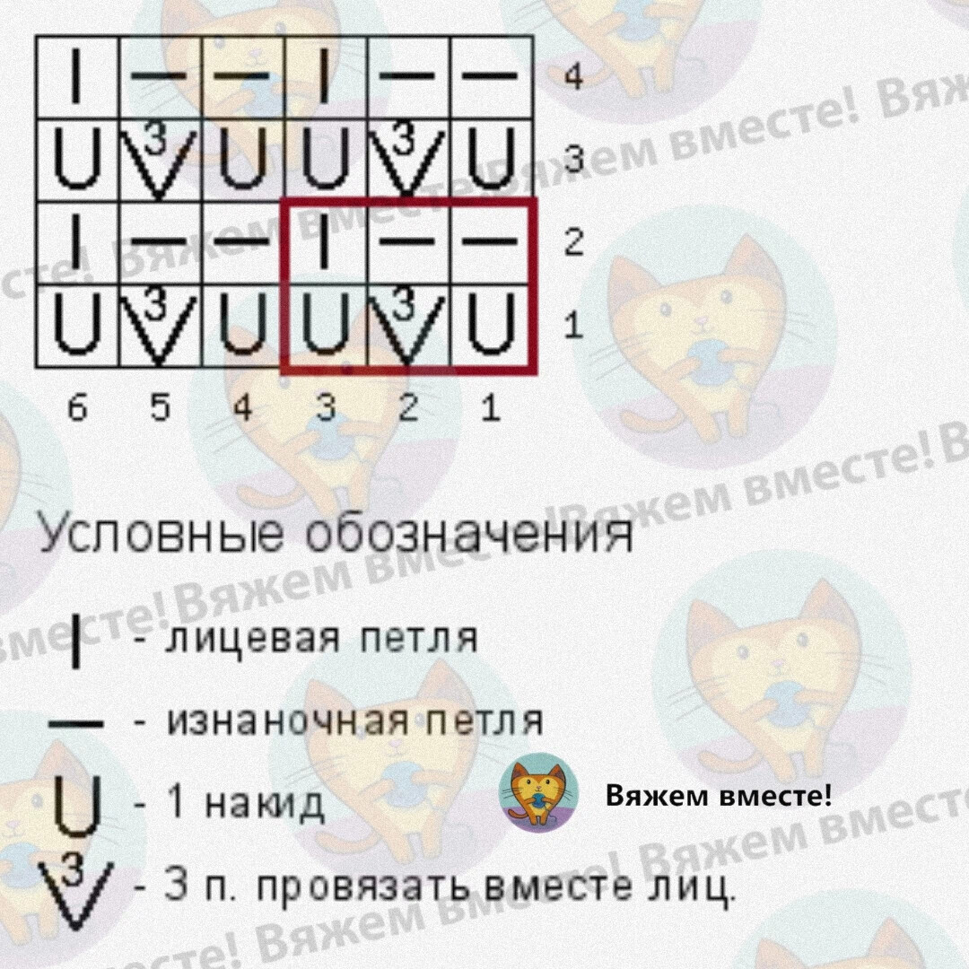 Схема вязания сетчатого узора ниже. Раппорт равен трём петлям по ширине и всего двум рядам по высоте, выделен красной рамкой.