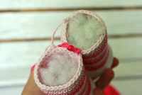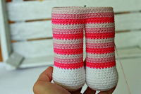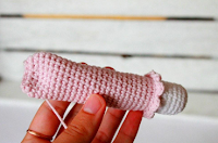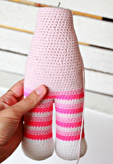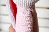 Нитью малинового цвета соединяем лапы между собой 3 СБН, ставим маркер и продолжаем вязать по кругу (это и будет начало нового круга).