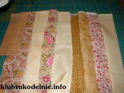 1. Сошьем полоски ткани по 2 штуки. Получится три полоски из сшитых по паре. Из двух этих сшитых полосок отрежем 51,5 см и сошьем друг с другом. Получится деталь из четырех полос размером 51,5 х 21,5 см.
