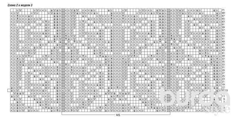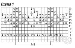 Важно: в 15-м р. в каждом раппорте прибавить по 2 накида, а в начале и в конце – по 1 накиду, поэтому на схеме показан расширенный ряд. Количество прибавленных петель уменьшить в следующем лицевом ряду за счет убавок.