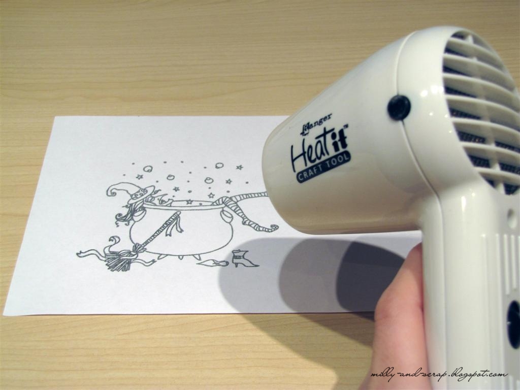Итак, сначала распечатываю нужную мне картинку - хелоуинская пьяная ведьмочка. На фото мой набор гелевых ручек - купила в обычном канцелярском и прозрачная пудра Fine detail от Ranger (она мелкая и как раз ложиться пудрой, а не комочками и не сильно растекается при обработке феном).