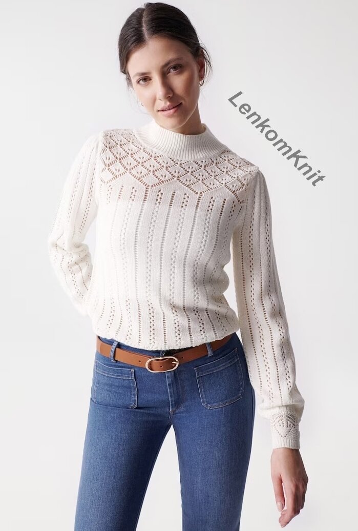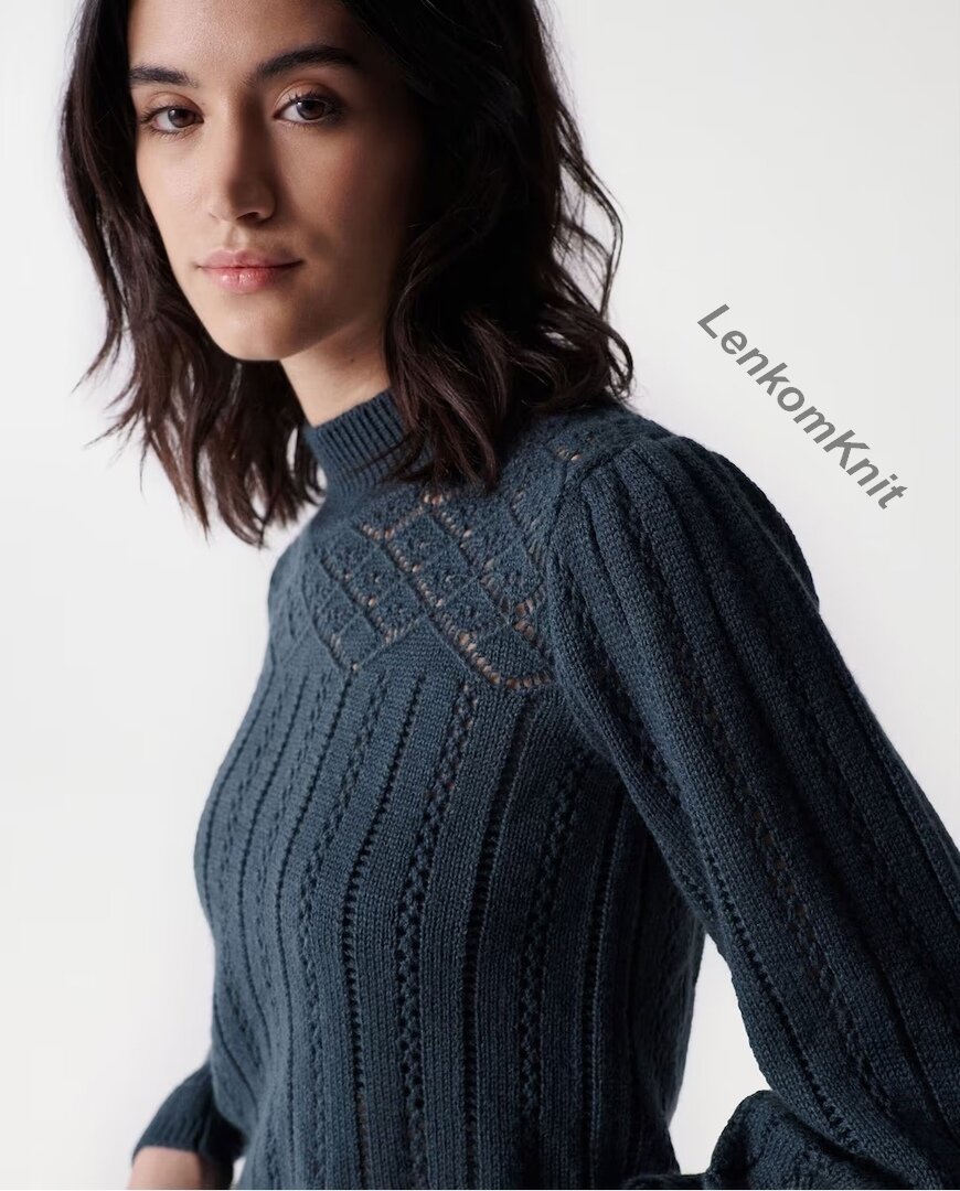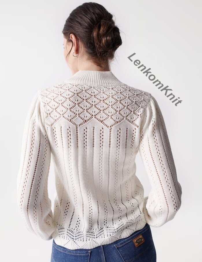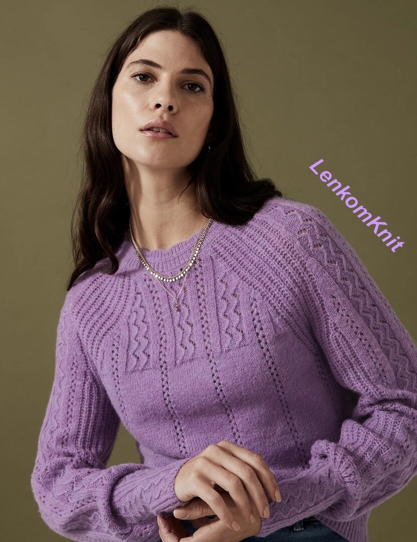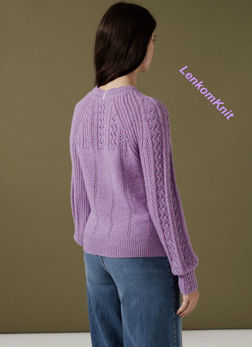 Эта модель связана из тонкой и мягкой пряжи нежно-сиреневого цвета. Основная часть связана редкими вертикальными ажурными дорожками. В верхней части связан узор, визуально формирующий кокетку.