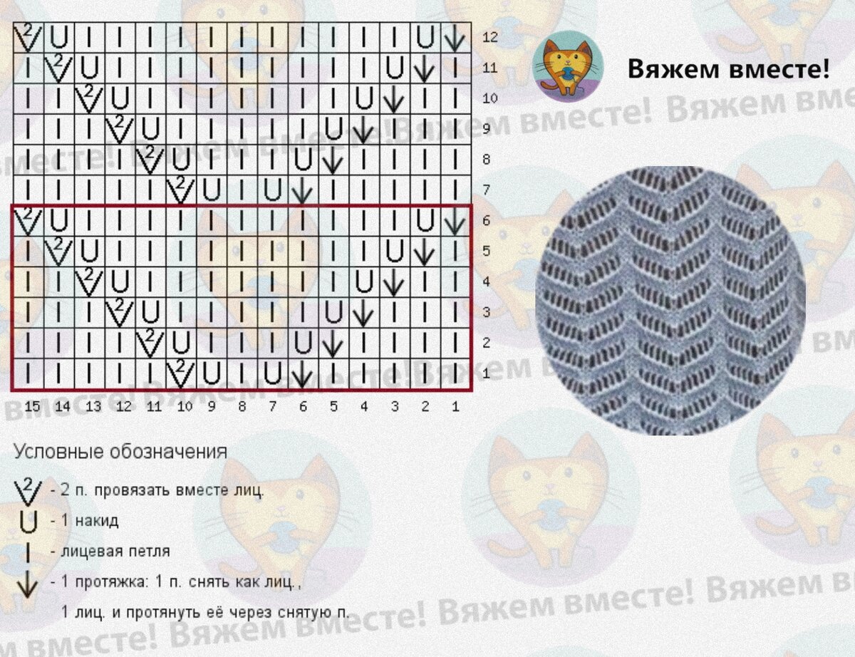 Узор простой. Раппорт равен 15 петлям по ширине и 6 рядам по высоте, обозначен красной рамкой на схеме.