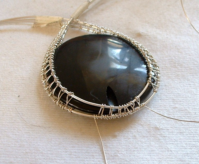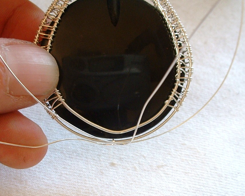 Плетение вниз примерно на дюйм и повторить процесс с другой стороны, чтобы сохранить напряжение сбалансировано. На данный момент удалить сторону куски ленты. Удалите остатки ленты из проволоки и координационные сейчас. Продолжайте плетение вниз с каждой стороны. В зависимости от размера вашего кулон у вас будет достаточно провода для удовлетворения как обертывания в центре внизу. В моем случае я отрезал 1/3 длины закончить дно. Если обрыва, или вам нужно больше длины. Убедитесь, что вы в конечном в центре кадра и оставить небольшой хвост. Для начала подключения переплетения, ветер свой вокруг провода центре кадра внизу, выстраиваются упаковки проволоки на это полпути. Продолжить модель ткацкого до обеих сторон до конца и отвечать на центральной проволоки с 2 обертывания, где вы остановились