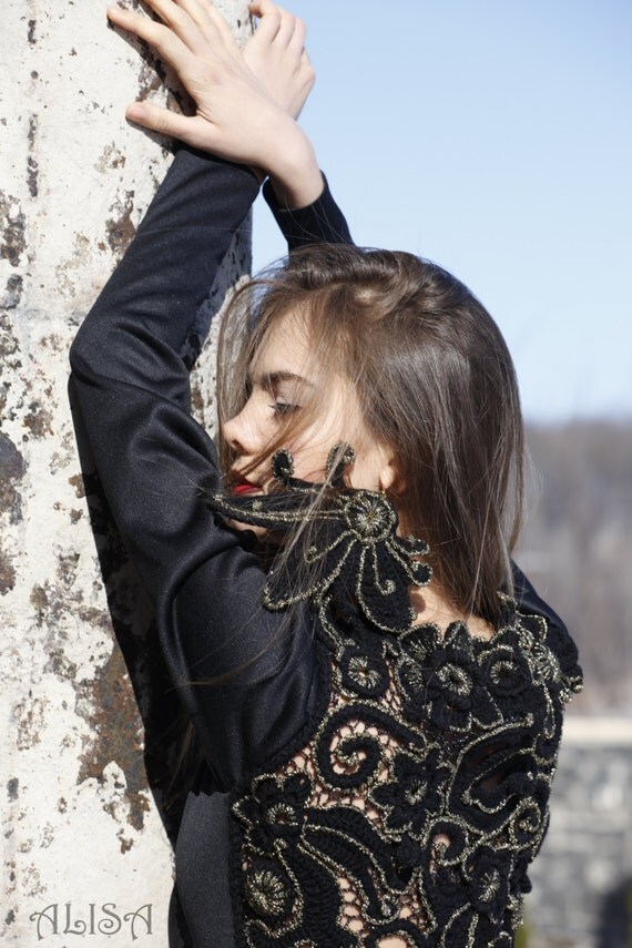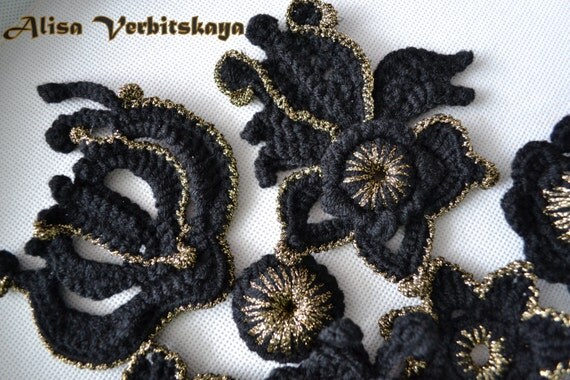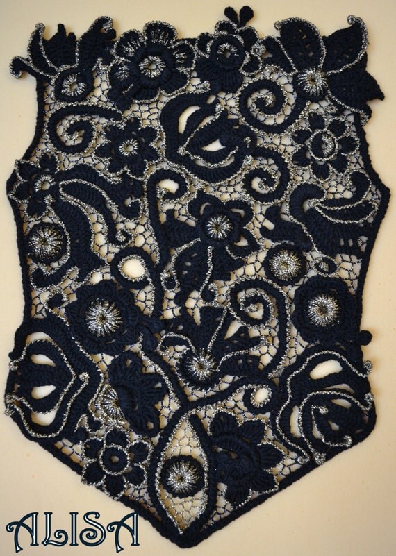 Вставка спинки связана в технике ирландского кружева. Платье,джемпер,костюм станет праздничным и нарядным .Связано из толстой пряжи с элементами металлизированной нити золотого цвета,нерегулярная сетка связана из металлизированной нити серебряного цвета.