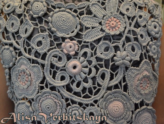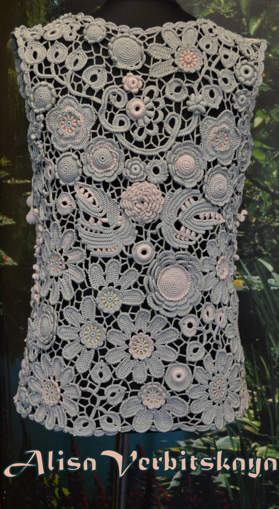Жилет связан крючком из толстой хлопковой пряжи в технике ирландского кружева. использовано 5 оттенков пряжи,разной толщины и фактуры.
