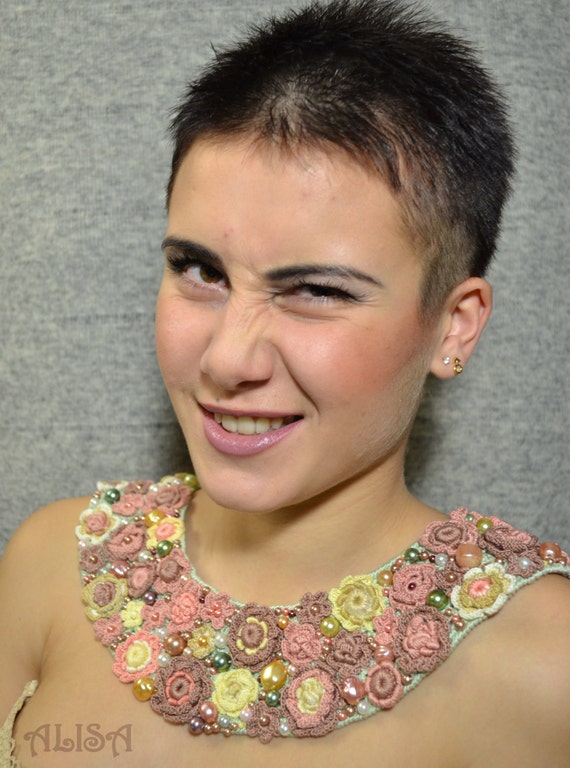Воротник связан крючком ,основа так же связана. Расшито жемчужными бусинами из хрусталя,разных размеров.Подшито гобеленовой тканью. Кружевные завязки позволяют задавать воротнику различные формы.