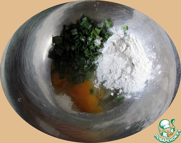 В миску разбиваем яйца, добавляем соль, сахар, травы итальянской кухни, нарезанный зеленый лук и муку