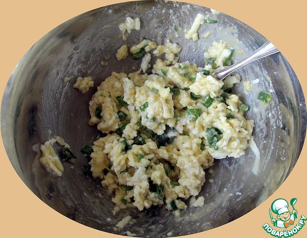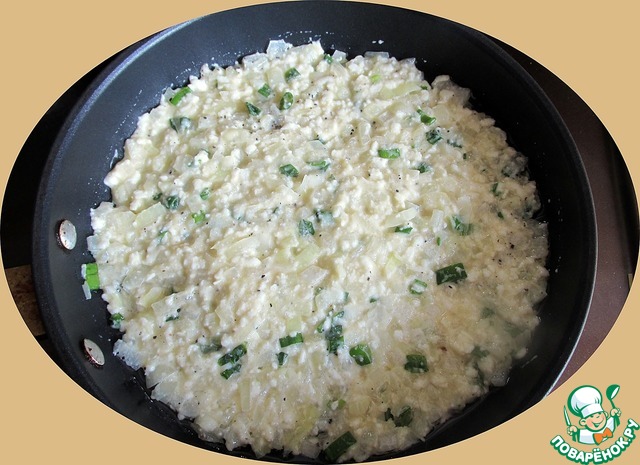 Сковороду, диаметром 20 см, смазываем растительным маслом, ставим на средний огонь и немного разогреваем. Выкладываем луковое тесто, разравниваем ложкой.