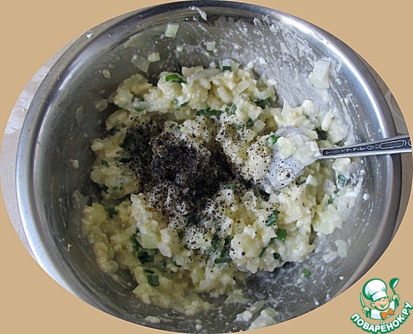 Репчатый лук откидываем на сито, несколько раз встряхиваем, освобождаясь от воды, выкладываем в миску, присыпаем черным перцем и хорошо вымешиваем