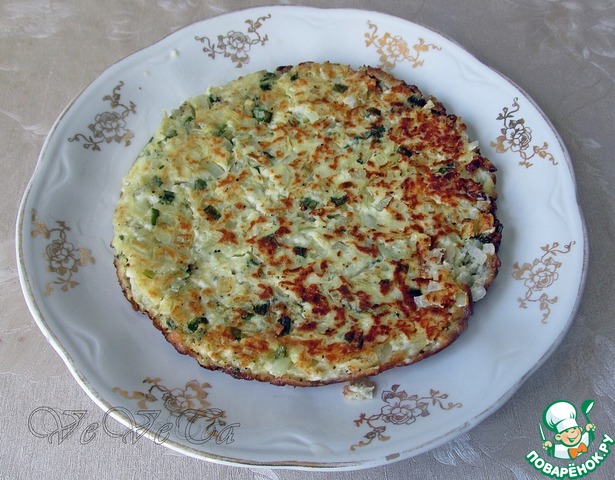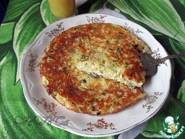 Теперь пирог нужно перевернуть на другую сторону. Можно сделать это широкой лопаткой, но я, чтобы не рисковать, просто переворачиваю пирог на другую сковороду, немного большего диаметра, и жарю ещё 10 минут.