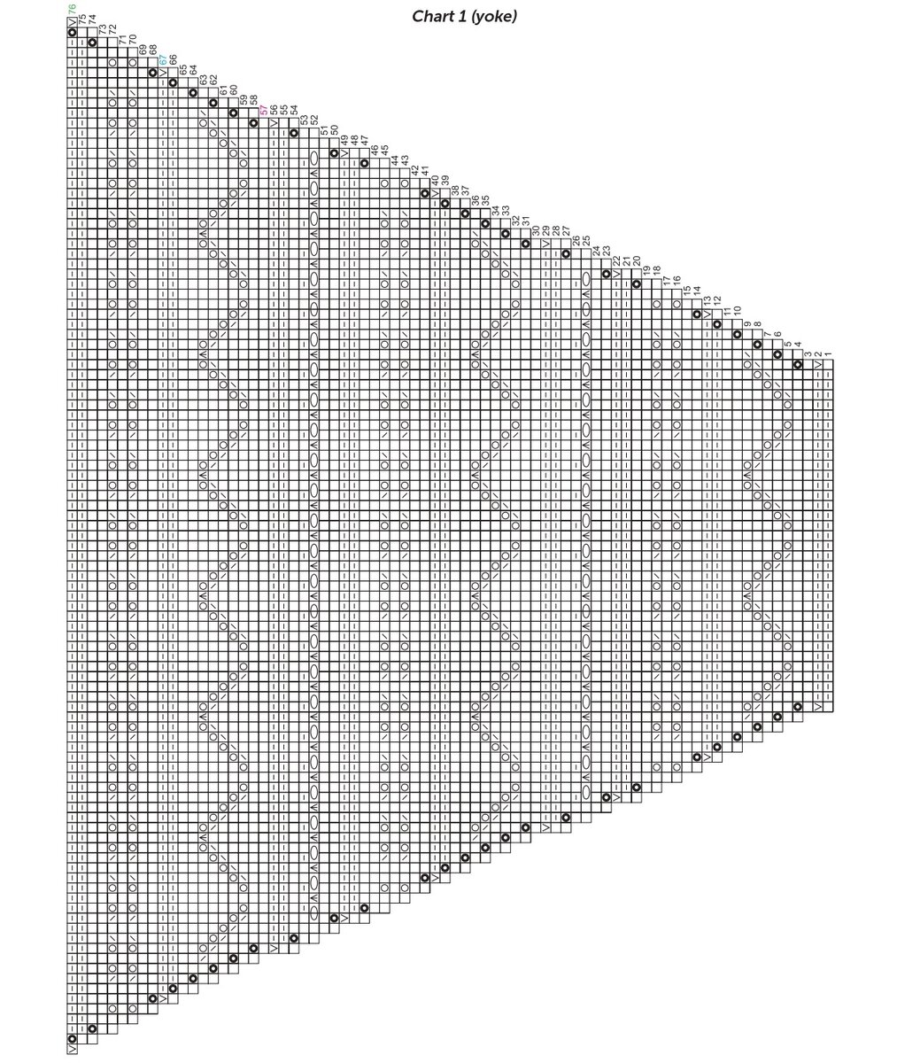 Ажурный узор для кокетки: вяжется круговыми рядами по схеме 1 Цифрами (по правой стороне схемы) обозначены ряды. Ряды вяжутся справа налево. В схеме приведен один раппорт, каждый раппорт повторяется 4 раза. Начните вязание с 35 п. в раппорте, затем прибавляйте петли так, как показано на схеме. Провяжите ряды 1-57/67/76 1 раз, по окончании у вас должно получиться 83/93/103 петель в раппорте.