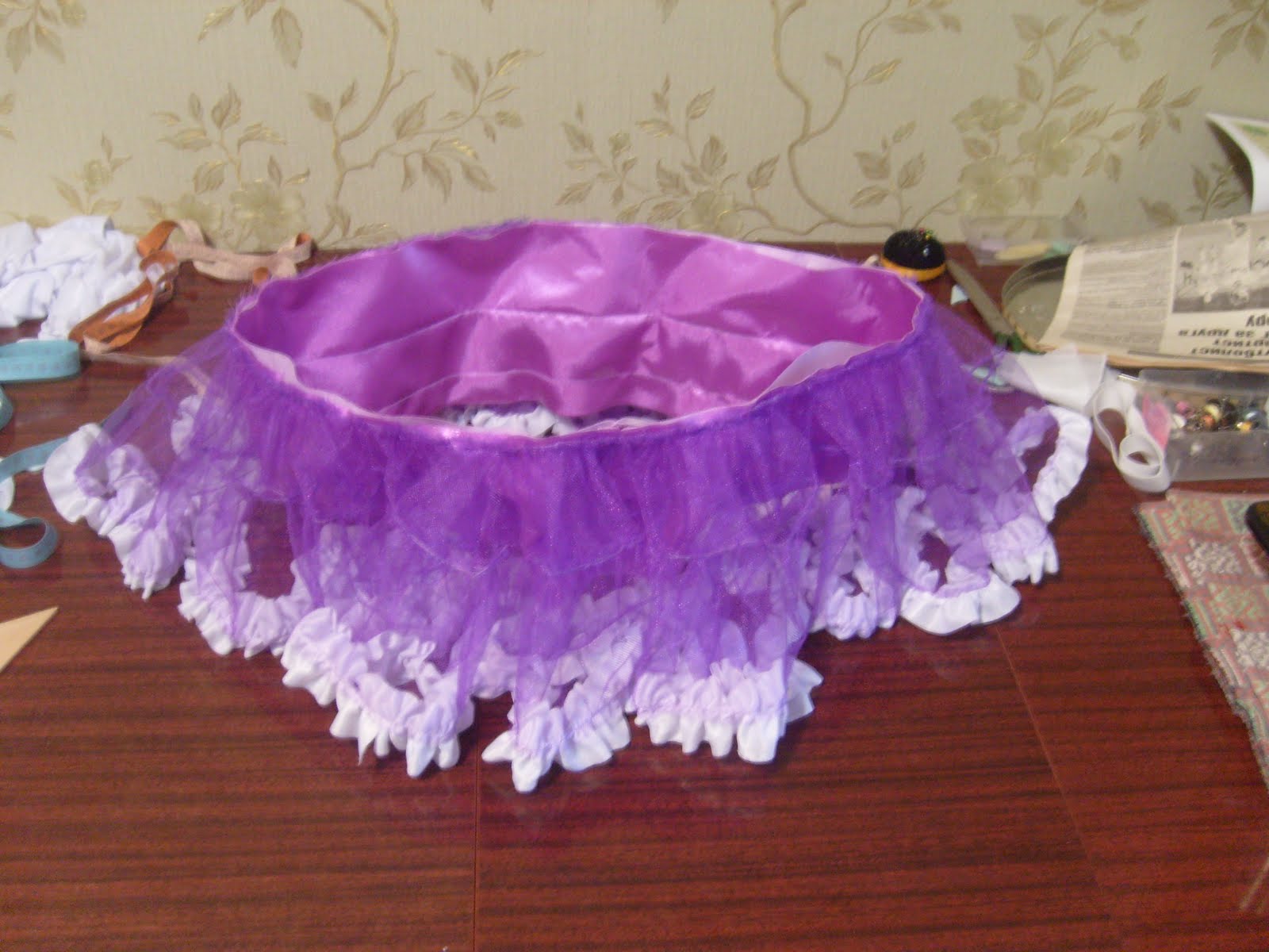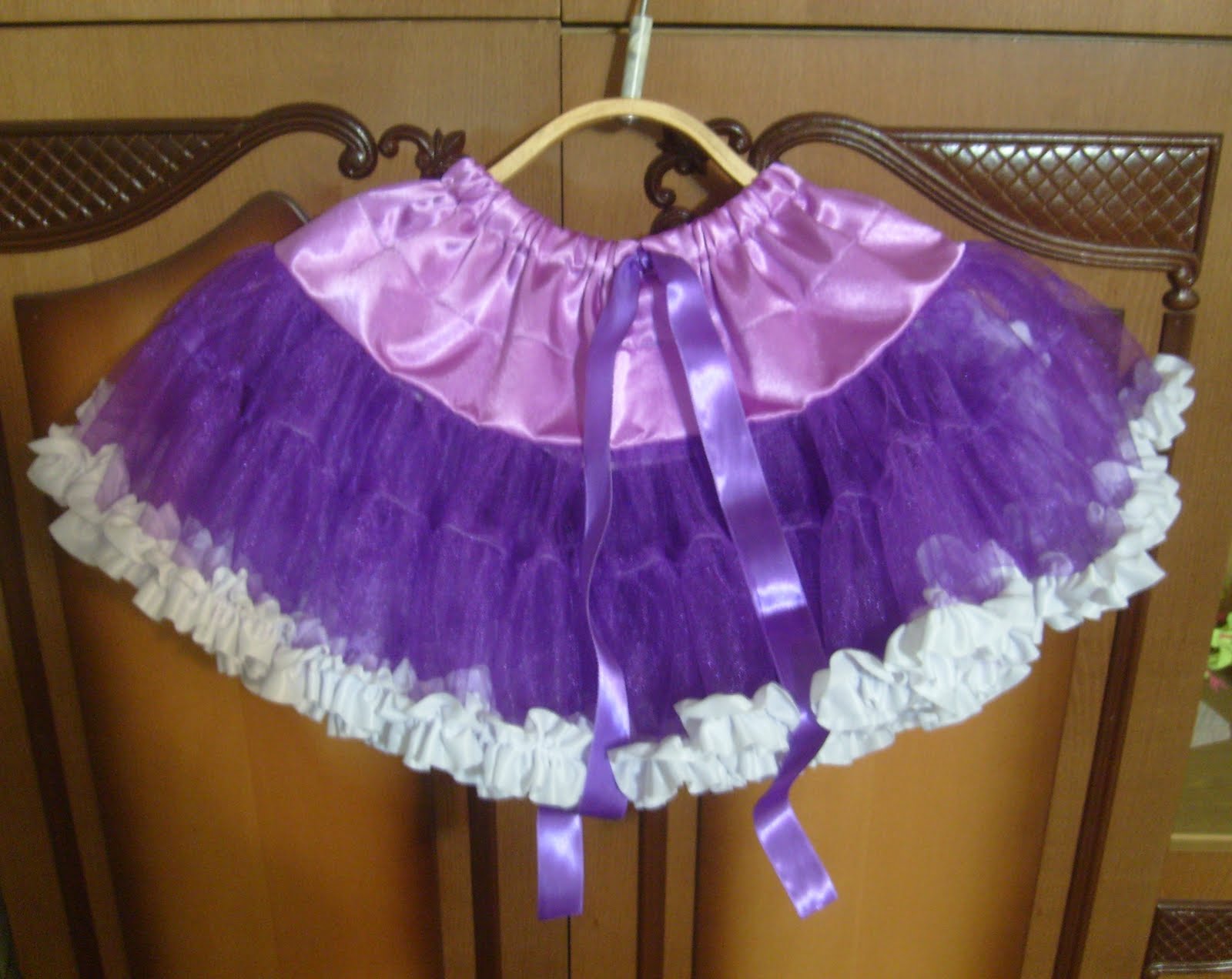 [показать] Обрабатываем срезы на оверлоке или на зиг-заге, так как креп-сатин ткань сыпучая. Осталось затянуть резинку в кулиску, через отверстие, которое мы оставили. К краям резинки пришить ленточки и завязать их на бантик. Юбка Pettiskirt готова.