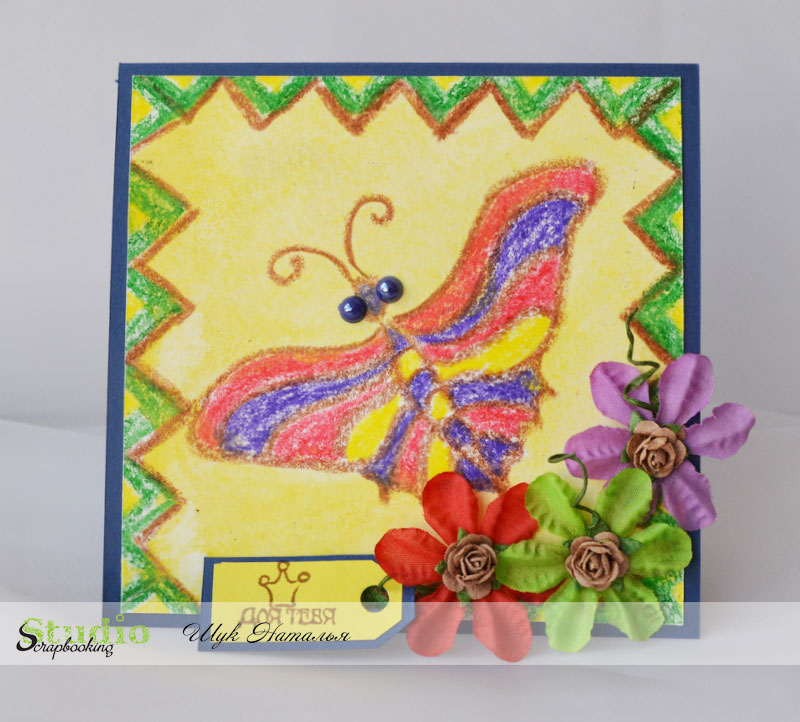 Бабочка и рамочка нарисованы восковыми карандашами.