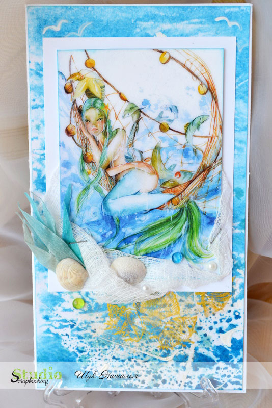Украшена картинкой, марлей, ракушками, штампом "ракушки",