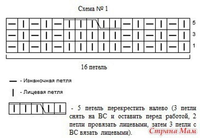 5 влево - 5 петель перекрестить налево (3 петли снять на ВС и оставить перед работой, 2 петли провязать лицевыми, затем 3 петли с ВС вязать лицевыми).