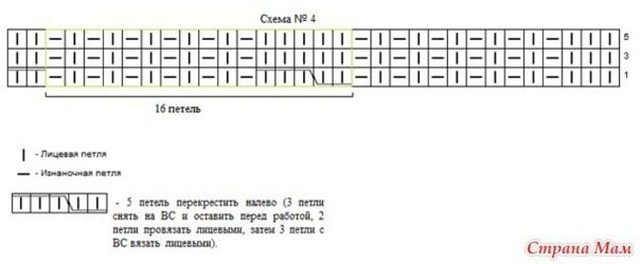 Далее вязать резинку на спицах 3 мм по схеме №4.